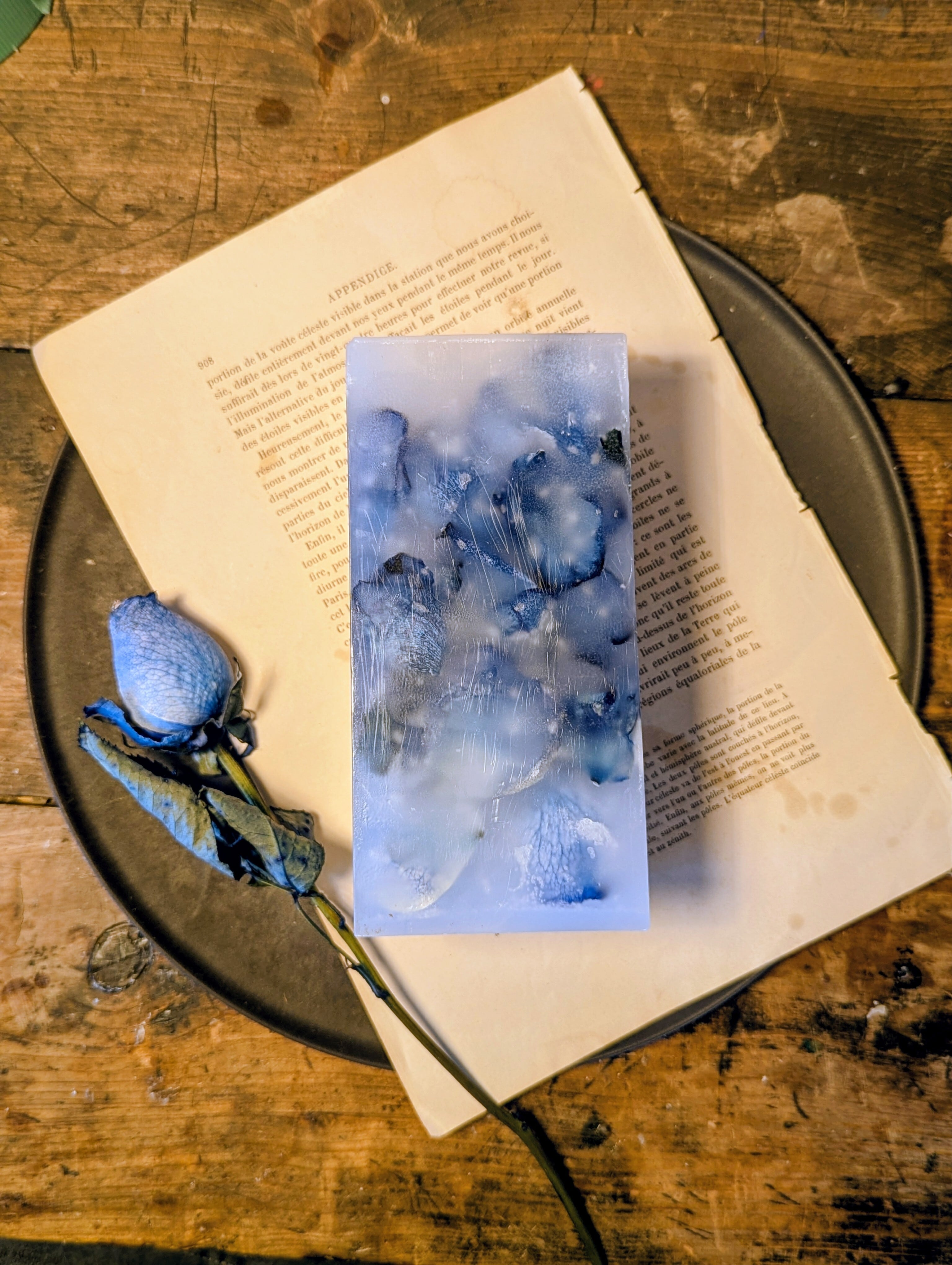 青い薔薇、ブルーローズをふんだんに蝋に閉じ込めたボタニカルボックスとなります。