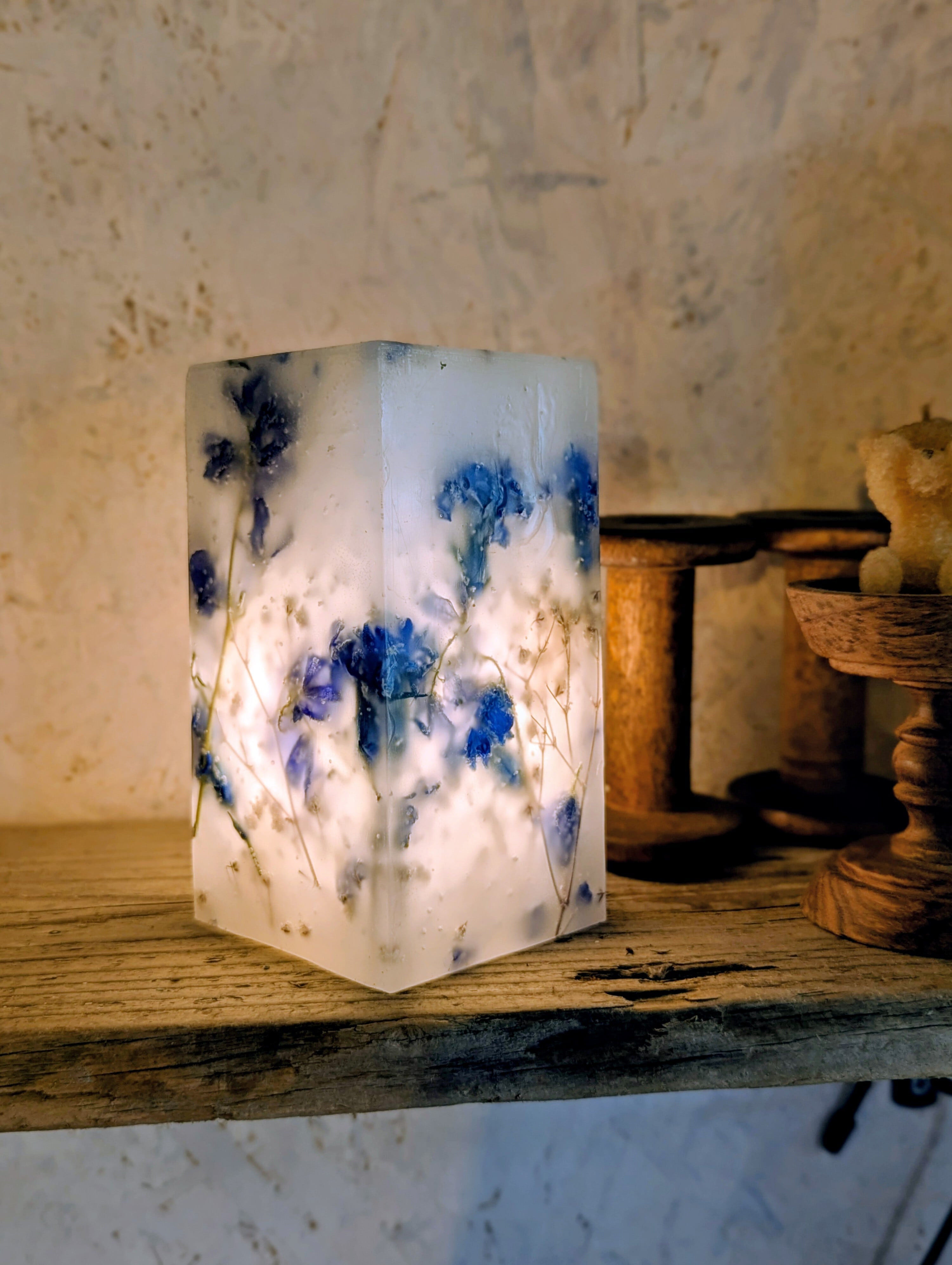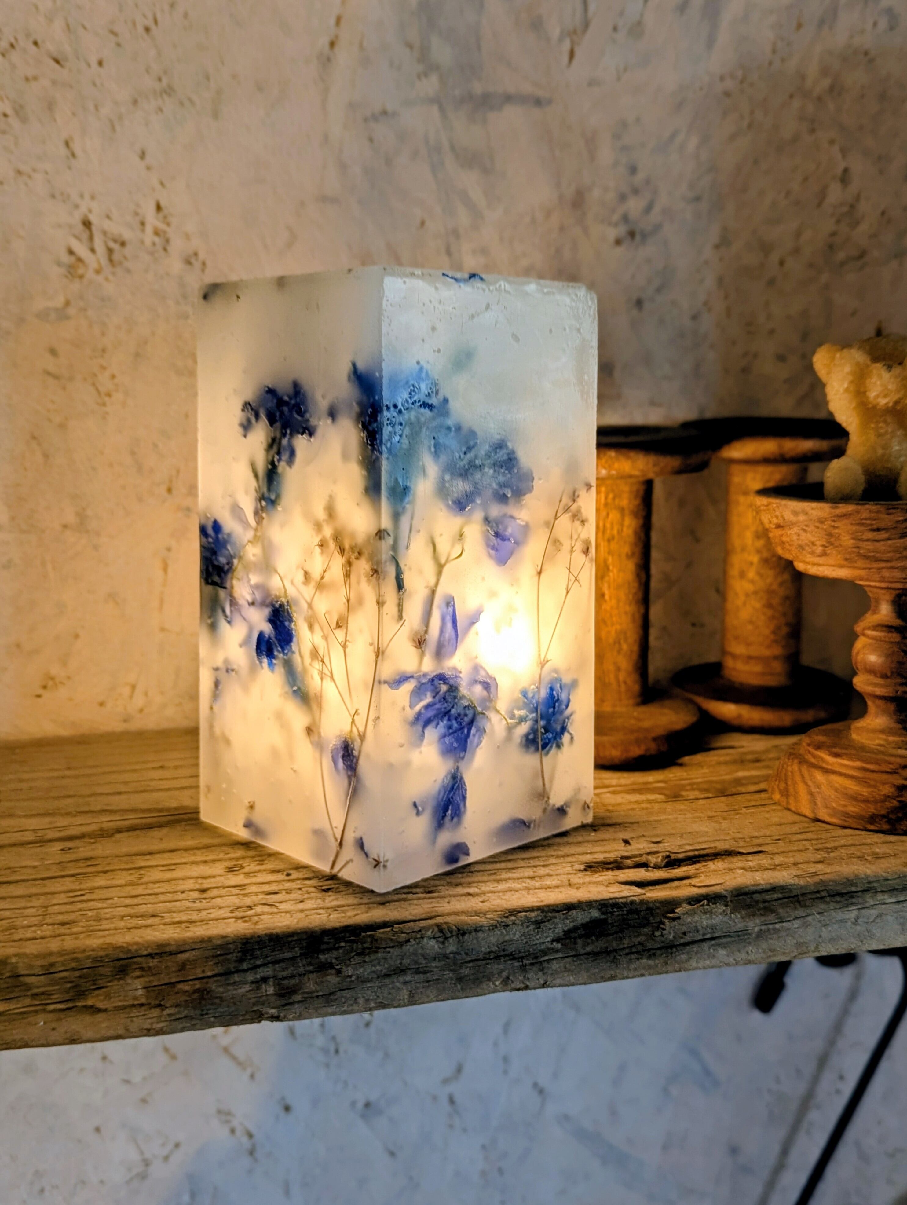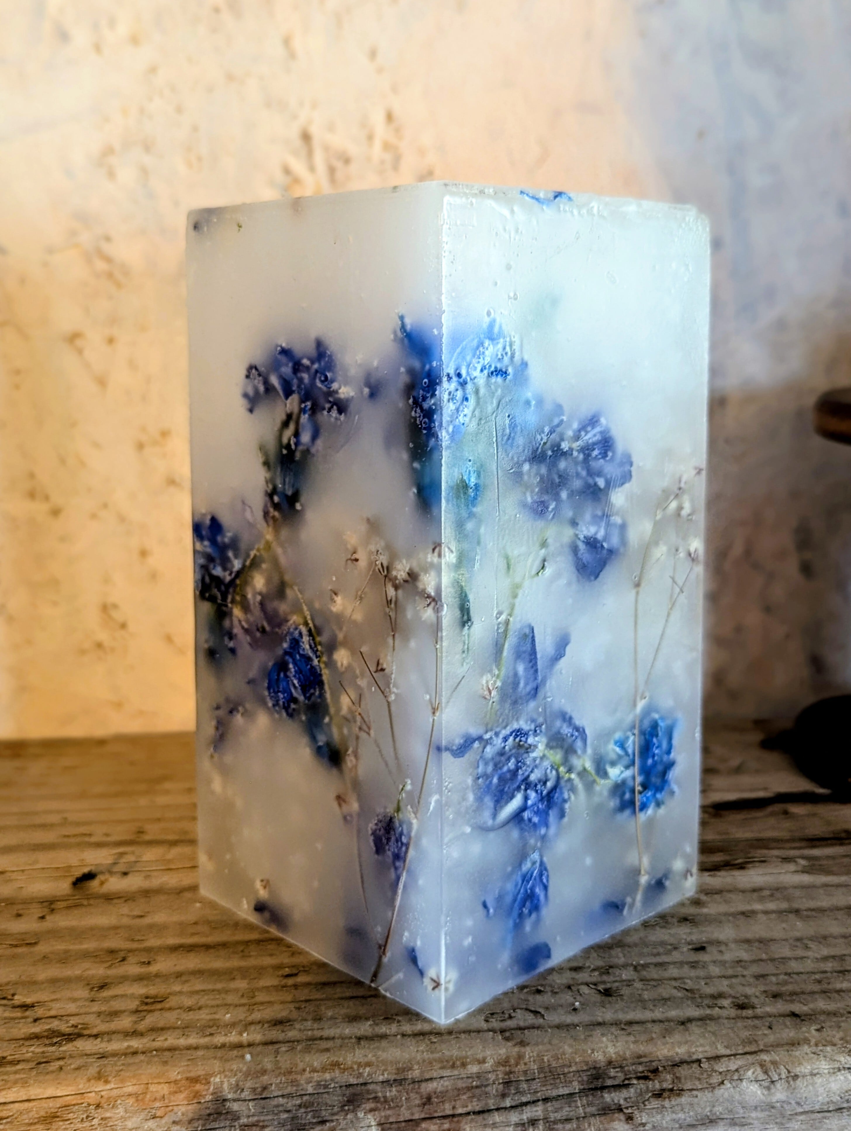 青いマム、青いデルフィニウム、カスミソウの3種類のお花をふんだんに蝋に閉じ込めたボタニカルボックスとなります。