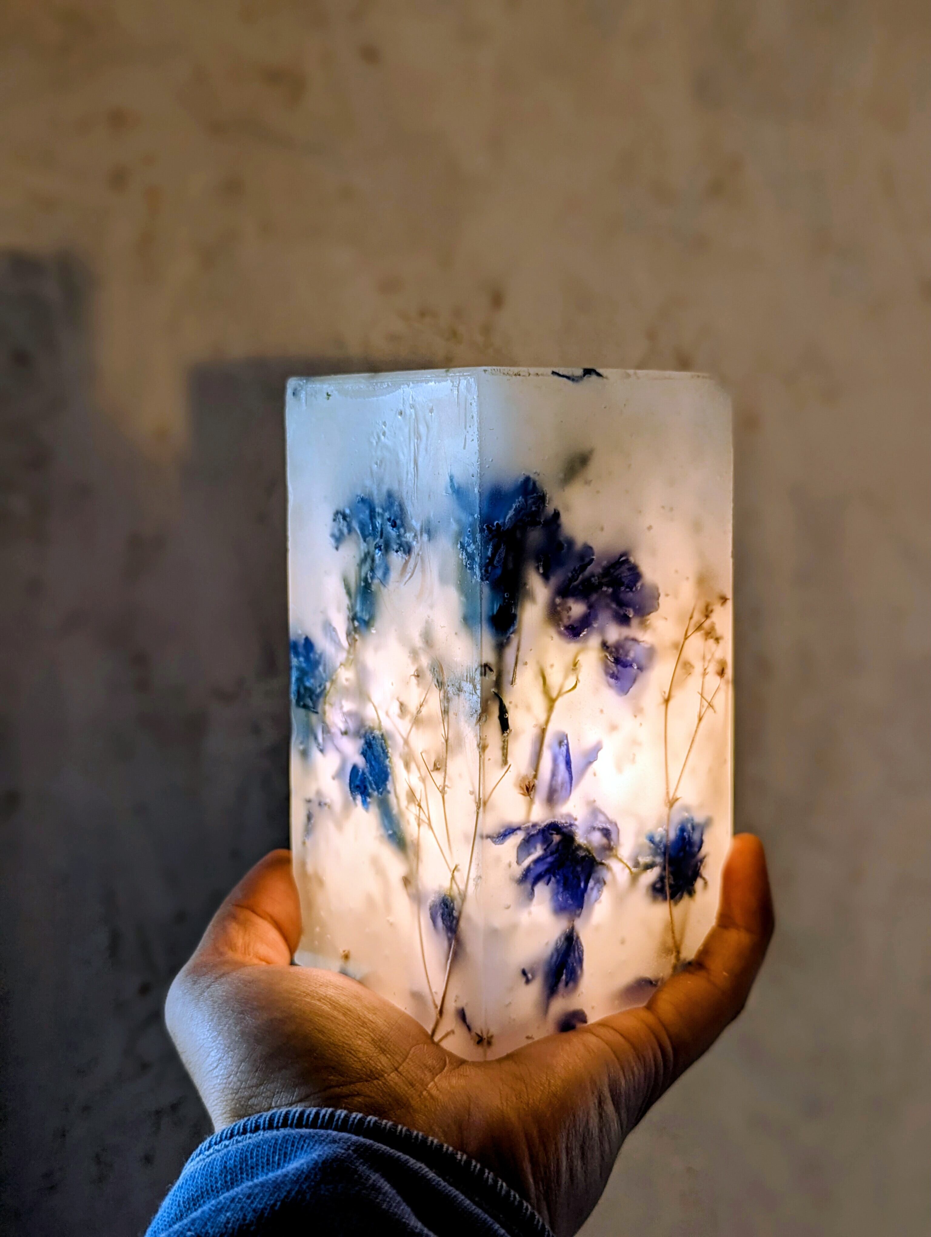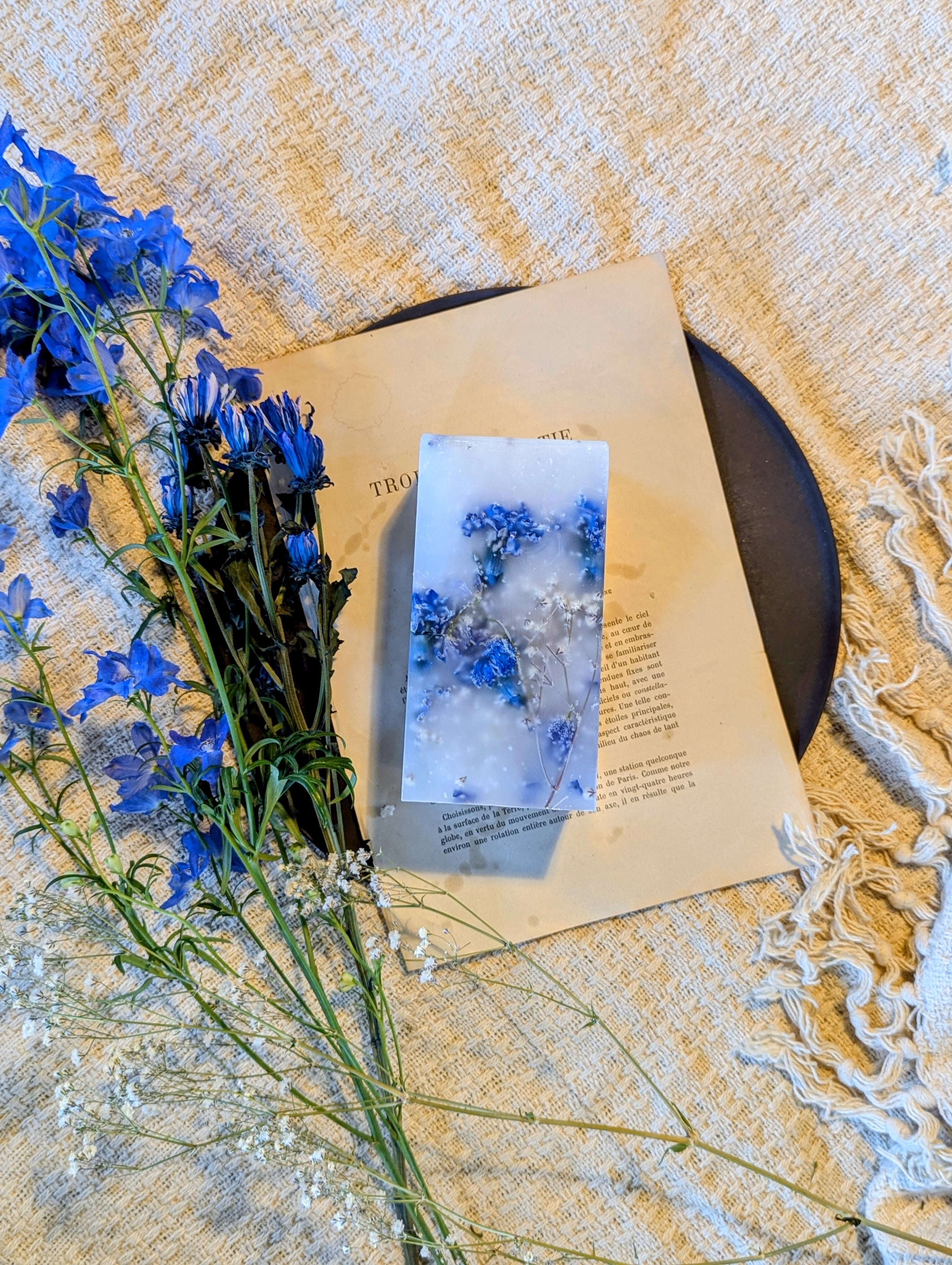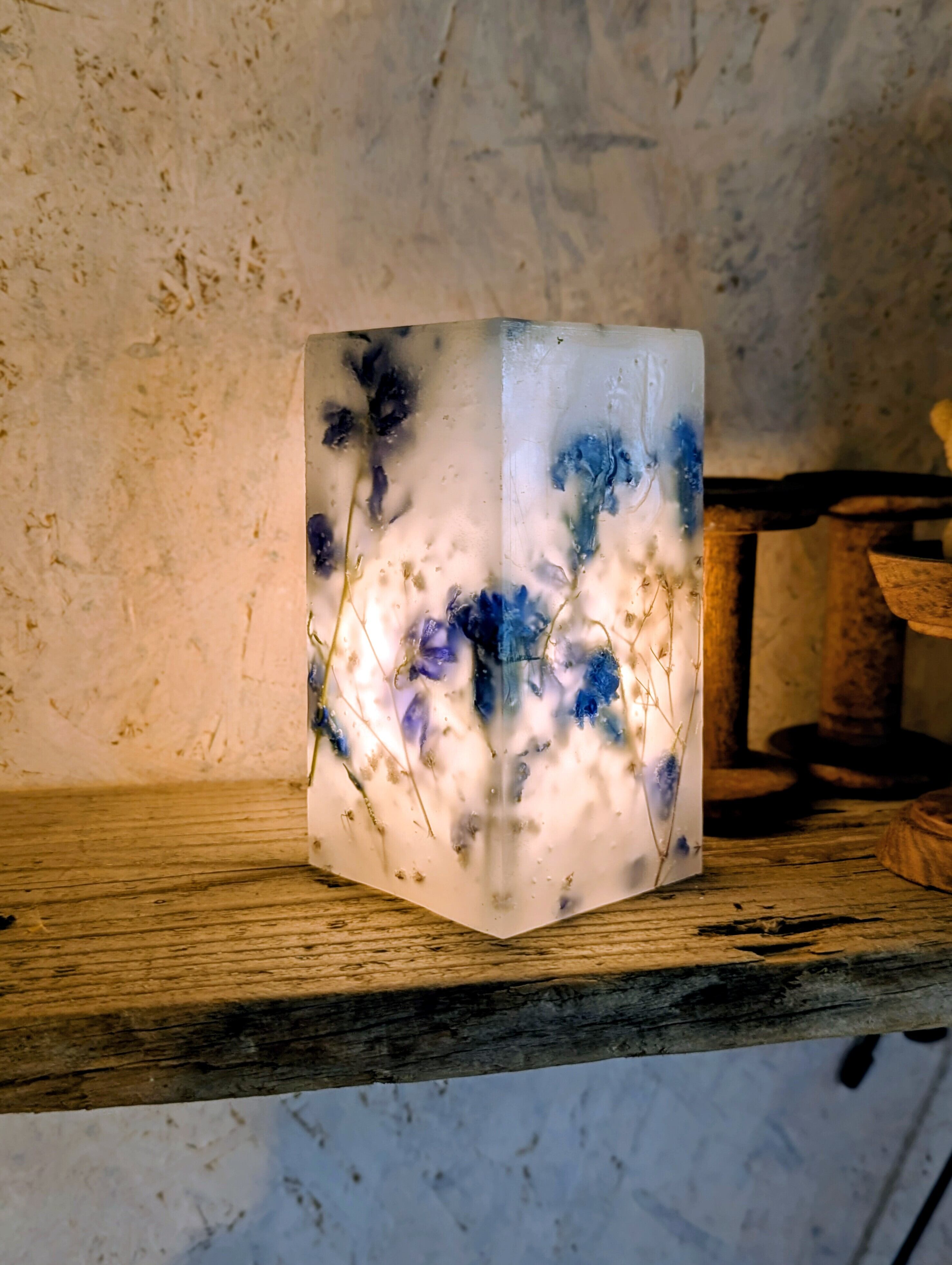 青いマム、青いデルフィニウム、カスミソウの3種類のお花をふんだんに蝋に閉じ込めたボタニカルボックスとなります。